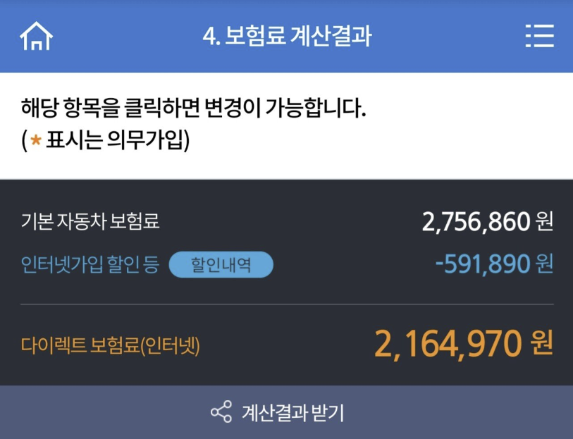 실제 사고이력, 운전경력, 차종에 따라 본인의 보험료는 이 값과 다르게 나올 수 있다는 점을 유의하시길 바랍니다. 정확한 삼성화재 자동차보험 보험료를 계산하려면 하단 링크를 참고하세요.