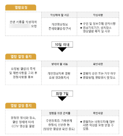 이때 CCTV 열람은 요청서 제출 10일 이내, 결정통지 회신 최장 7일 이내 열람할 수 있습니다.