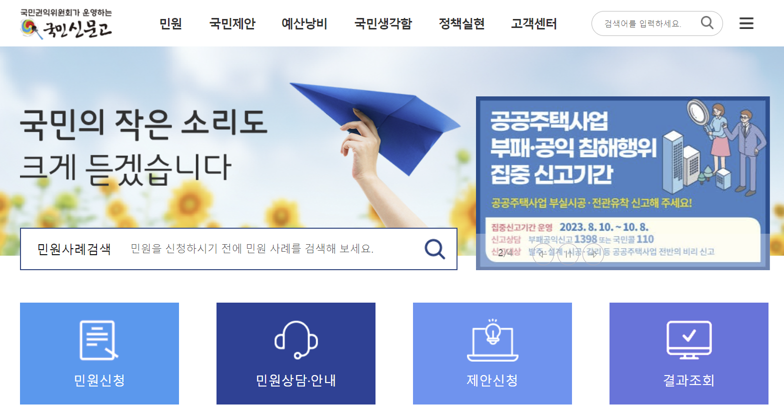 하단 링크를 클릭하시면 국민신문고 사이트에 접속하실 수 있습니다.