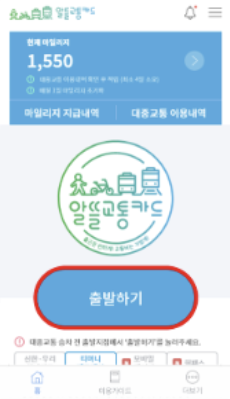4. 출발지에 출발 후 화면 중앙에 위치한 출발 버튼을 터치하면 적립이 시작됩니다.