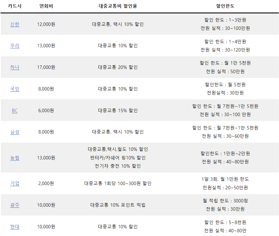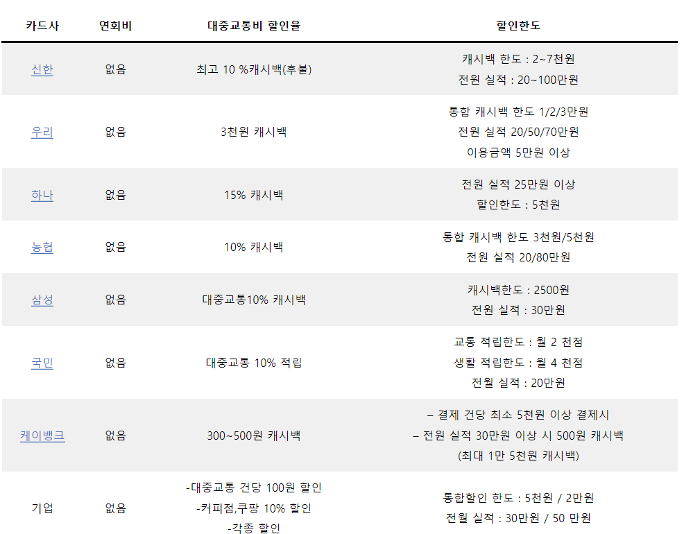 알뜰교통카드 신용카드 비교는 다음 표를 참고하세요.