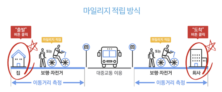 대중교통 이용 시 별도 앱을 이용해서 최초 출발지 > 출발 정류장까지 도보/자전거 이동 거리 및 도착 정류장 > 최종 도착지까지 도보/자전거 이동거리를 감안하여, 대중교통 운임의 일정 비율을 마일리지로 적립해 줍니다.
