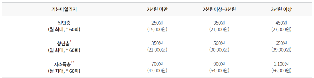 교통요금 지출액이 2천 원 미만일 경우 250원, 2천 원 이상 ~ 3천 원 미만은 350원, 3천 원 이상은 450원이 마일리지로 적립되는데요. 800m 미만 이동할 경우에는 이동거리에 비례하여 지급하고, 월 15회 이상 대중교통 이용 시 지급하며 월 상한은 60회입니다.