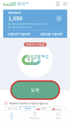 5. 목적지에 도착 시 도착버튼을 터치하여 버튼이 도착완료 상태로 바뀌면 정상적으로 마일리지가 적립됩니다.