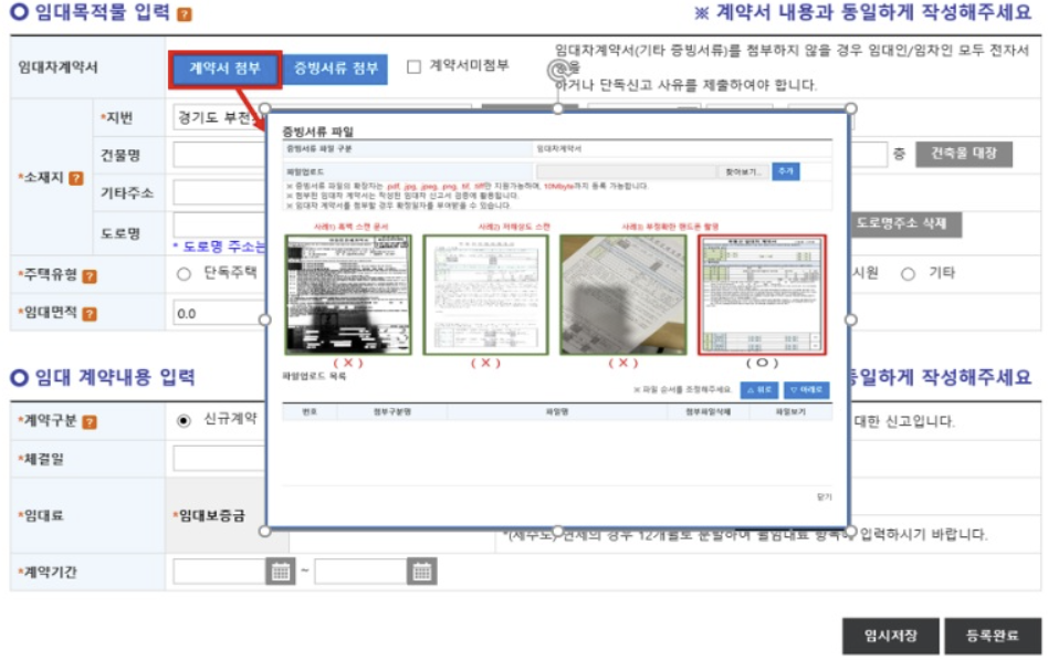 6. 실제 임대차계약을 한 계약서를 사진으로 찍어 첨부를 하고, 소재지에 대한 정보도 입력합니다. 소재지에 대한 정보를 검색으로 불러들여 기입할 경우, 임대면적 등과 같은 정보는 자동으로 채워지니 참고하시길 바랍니다.