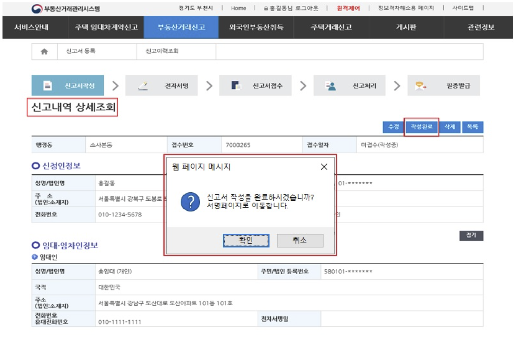 7. 작성완료 및 서명을 하시면 임대차신고 접수가 완료됩니다.