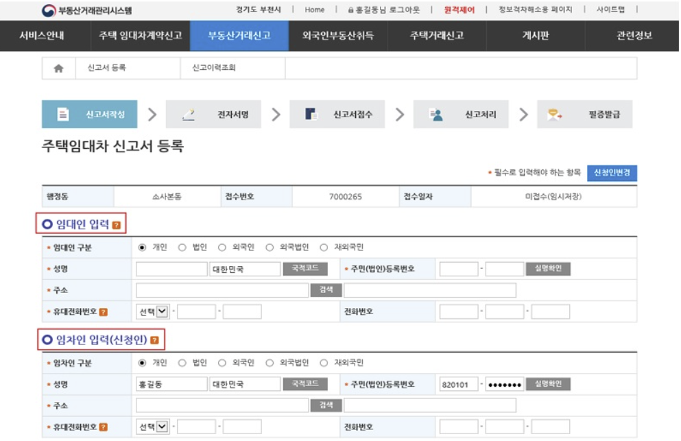 원칙적으로는 임대인과 임차인이 공동으로 신고서를 제출해야하나, 신고자들의 편의를 위해 임대인과 임차인의 인장과 성명이 공동으로 날인, 서명된 임대차 계약서를 제출할 경우 한쪽만 신고하더라도 공동 신고한 것으로 인정하고 있습니다.