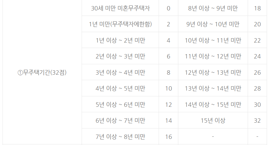 - 주택을 소유한 세대(분양권등 포함)와 만30세 미만. 미혼 무주택자는 0점입니다. 즉, 미혼이면서 30세 미만인 분은 집이 없더라도 무주택기간으로 인정받지 못합니다.