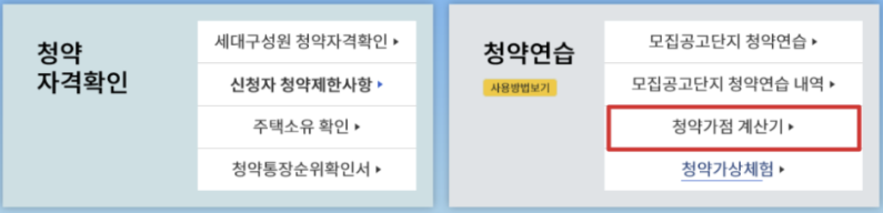 2. 청약홈 홈페이지에 메인 화면 아래쪽에 보시면 '청약 연습' 메뉴에 '청약가점 계산기' 메뉴가 있습니다. 청약가점 계산기 메뉴를 클릭하고 무주택기간 선택 화면에서 '상세보기'를 클릭합니다.