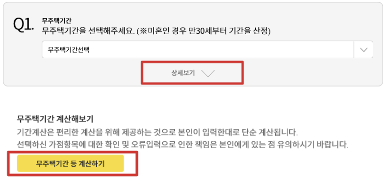 4. 이후 화면에서 생년월일, 혼인 여부 등 해당되는 사항을 입력한 후 '계산하기'를 클릭하면 무주택기간 확인할 수 있습니다.
