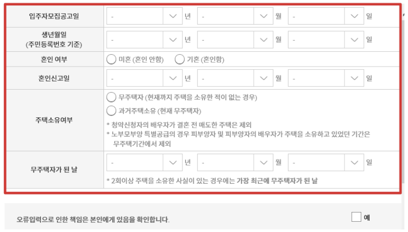 - 무주택자 여부는 세대에 속한 자 전원이 무주택일 경우이어야 합니다.
