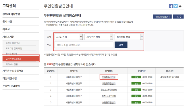 3. 기본증명서 무인발급기 위치 및 시간 과 함께 그 주소, 장소 등등 그리고 운영시간을 조회하며 주말 여부도 함께 확인 과 함께 검색을 통하여 가장 가까운 곳을 확인하실 수 있습니다.