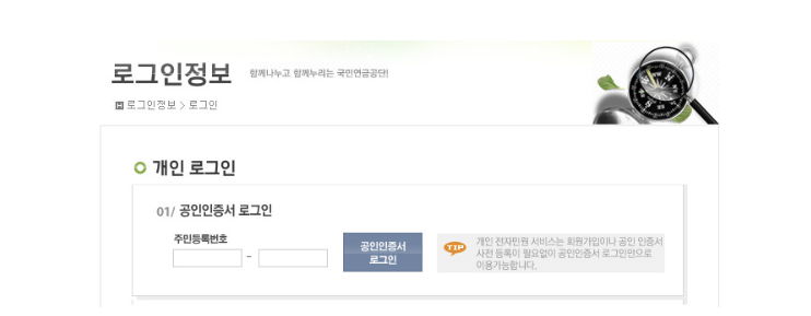 4. 공인인증서 로그인 화면이 나오면 주민등록번호를 입력한 후 준비한 공인인증서로 로그인해줍니다.