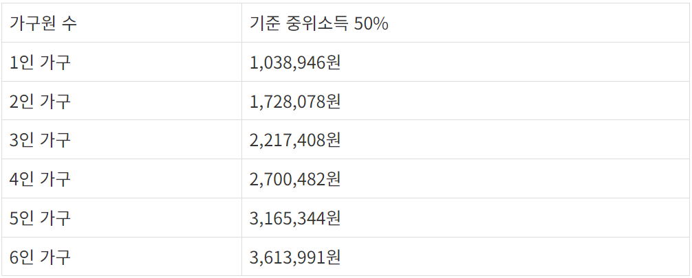 2023년 기준 가구원수 별 중위소득 50% 이하는 다음 표를 참고하세요.