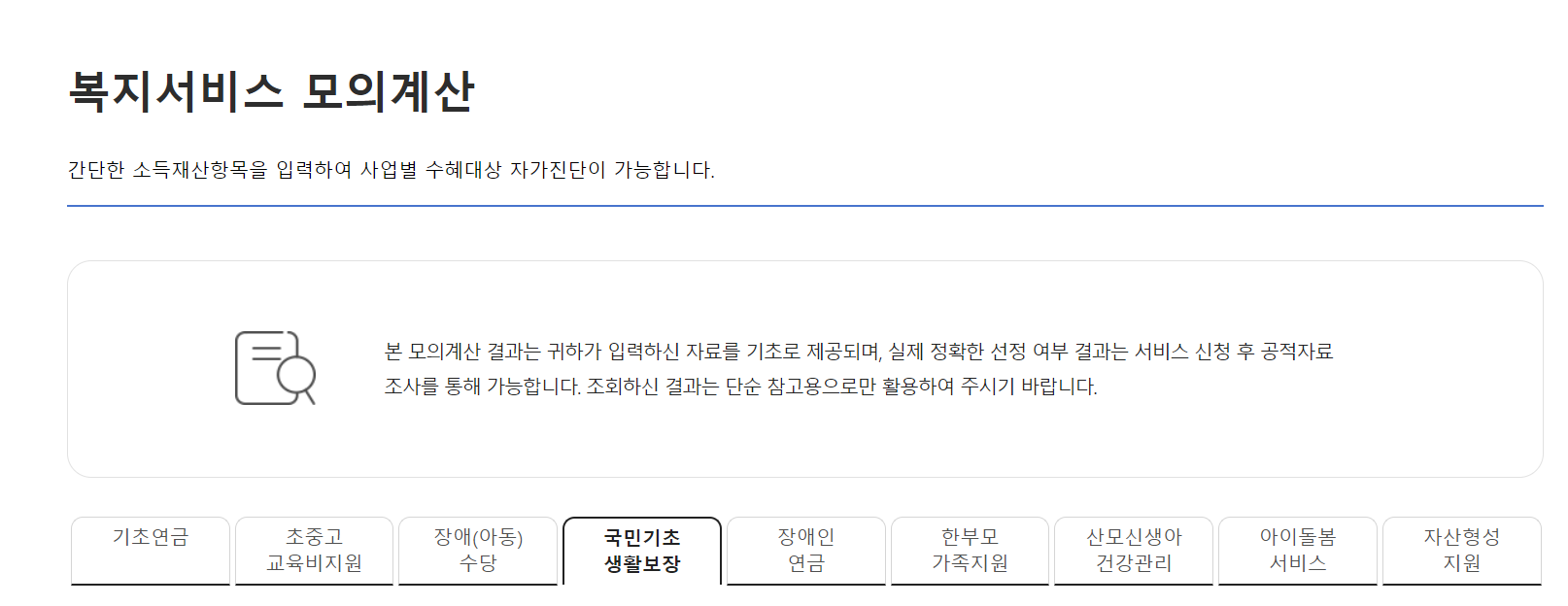 2. 화면 상단의 [복지서비스] - [모의계산] - [국민기초 생활보장]을 클릭합니다.