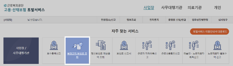 1. 고용·산재보험 토탈서비스 홈페이지에 로그인해줍니다.
