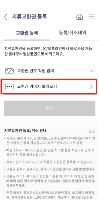 5. 그리고 카카오톡 선물하기 선물함에서 롯데모바일교환권 저장을 해두고 이미지불러오기를 해줍니다. 교환권번호 직접입력도 괜찮지만, 귀찮으니 그냥 이미지불러오기 하는게 편하니 참고하세요.