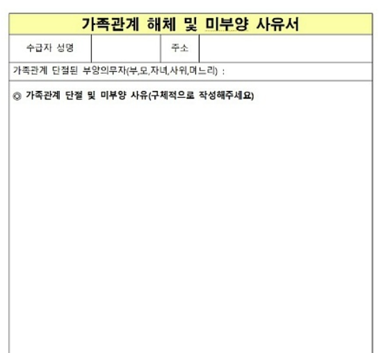 가족관계 해체 및 미부양 사유서란 수급 신청 시 부양의무자(1촌직계혈족 및 그 배우자)와 의 관계가 해체되어 부양의무자 관계가 이루어질 수 없음을 적는 서식인데요.