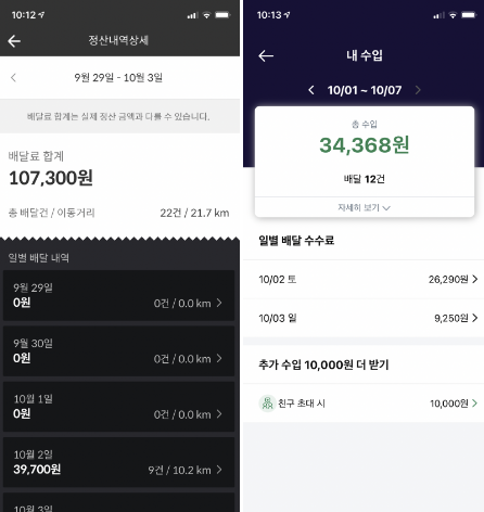 배민커넥트 107,300원 / 쿠팡이츠 34,368원