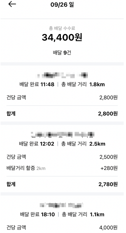 쿠팡이츠는 50건 정도 했는데, 기본 건당금액이 적은것은 2,500원부터 많은것은 8,000원까지 천차만별이었습니다. 운좋게 가까운거리에 기본 건당금액까지 높은걸 배정받았을때는 한건에 10,000원이 넘어가는것도 해보았습니다.