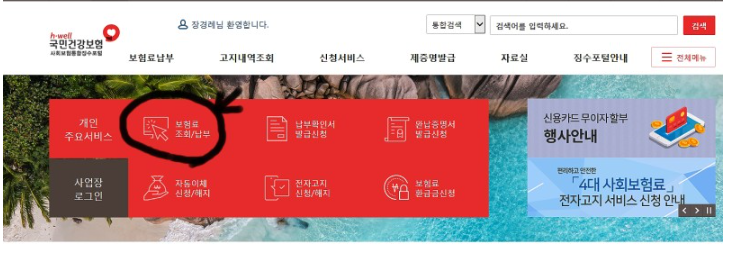 2. 사이트에 접속하셨으면 상단의 [보험료 조회/납부] 메뉴를 클릭합니다.