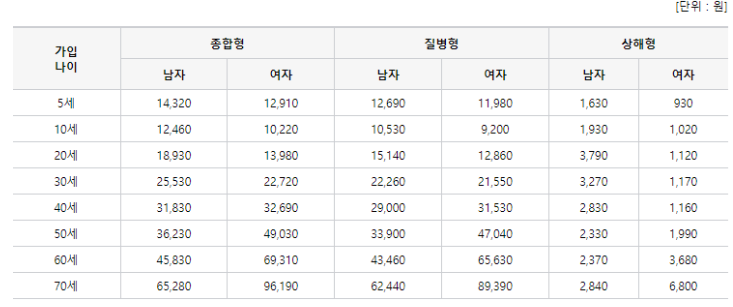 우제국 홈페이지 에서는 실손보험 가입에 참고를 하기 위해 보험료 예시표를 제공하고 있습니다. 5세부터 70세까지의 남자와 여자에 대해 종합형, 질병형, 상해형의 보험료 예시를 확인 할 수 있습니다.