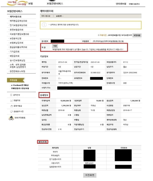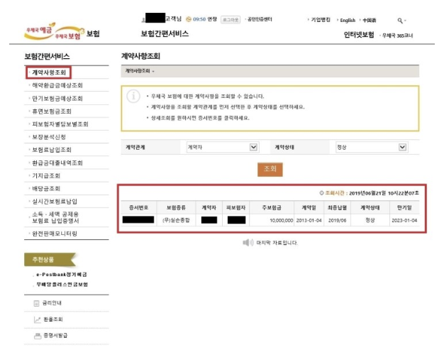 4. 우측에 조회 누르면 증서번호/보험종류/계약자/피보험자/주보험금/계약일/최종납월/계약상태/만기일 모두 조회가 가능합니다.