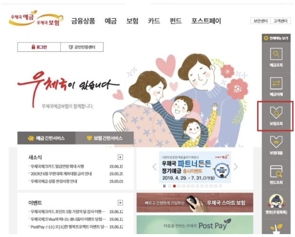 1. 우체국보험 메인 홈페이지 들어가서 우측 중간에 "보험조회"를 클릭합니다.
