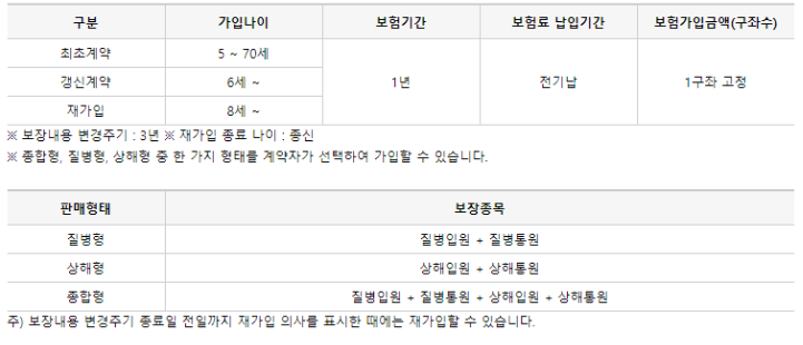 최초계약은 5~70세까지 가입이 가능하며 갱신계약은 6세 이후, 재가입은 8세이후로 가능하며 보험기간은 1년, 납입기간은 전기간입니다.