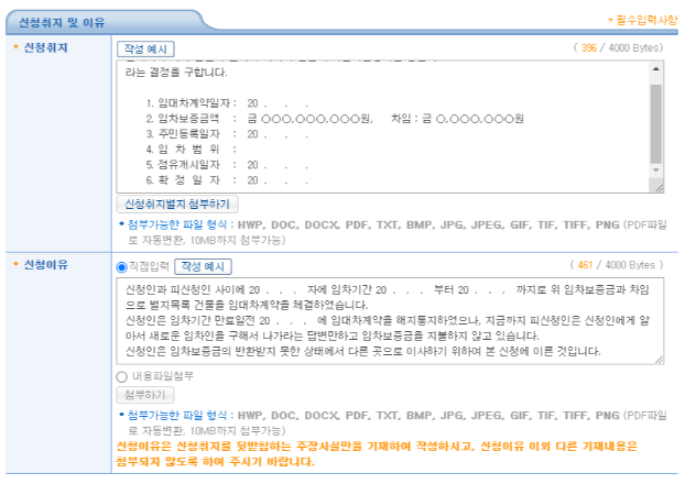 8. 신청취지는 전자소송에 기본으로 작성 예시가 나와 있으므로, 여기에 임대차계약일자, 임차보증금액, 주민등록일자, 임차범위, 점유개시일자, 확정일자 부분만 채워 넣으면 됩니다.